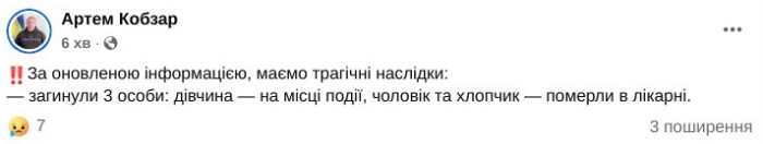 За оновленою інформацією, маємо трагічні наслідки, — зазначив він. — Загинули 3 особи: дівчина — на місці події, чоловік та хлопчик — померли в лікарні.