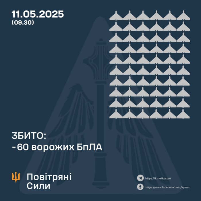 - підтверджено збиття 60 ударних БПЛА типу «Шахед» (безпілотників інших типів) на сході, півночі, півдні та в центрі країни;