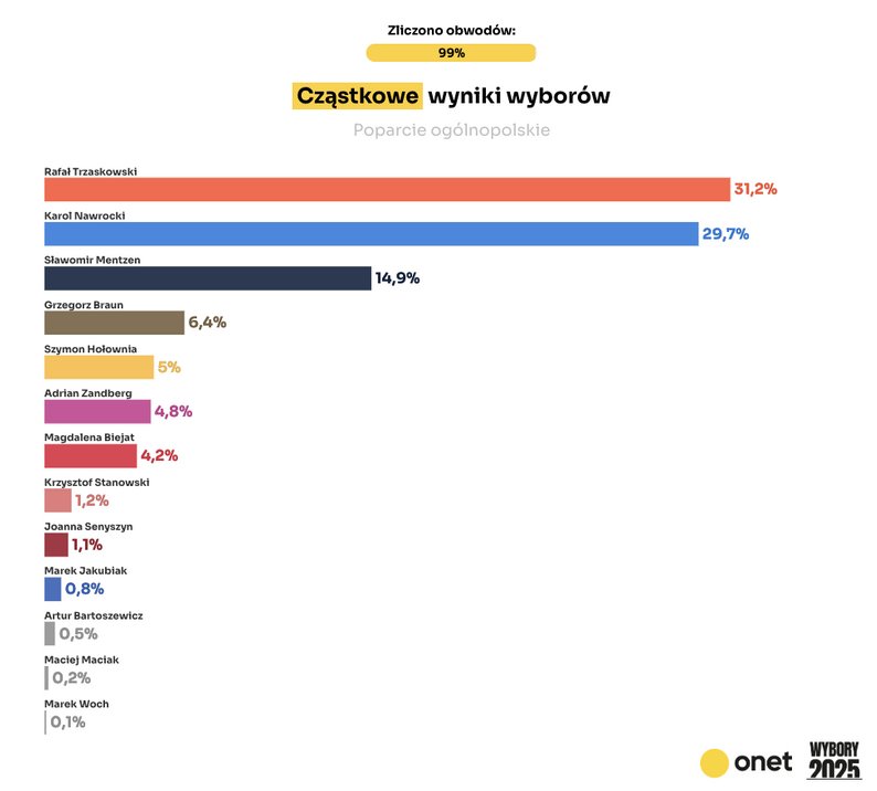 За результатами підрахунку 99,7% голосів перемагає кандидат від «Громадянської коаліції» й мер Варшави Рафал Тшасковський, зая кого проголосували 31,2% виборців. А на другому місці опинився кандидат від «Права та справедливості» Кароль Навроцький, який набрав 29,6% голосів. Про це повідомило видання Rzeczpospolita.