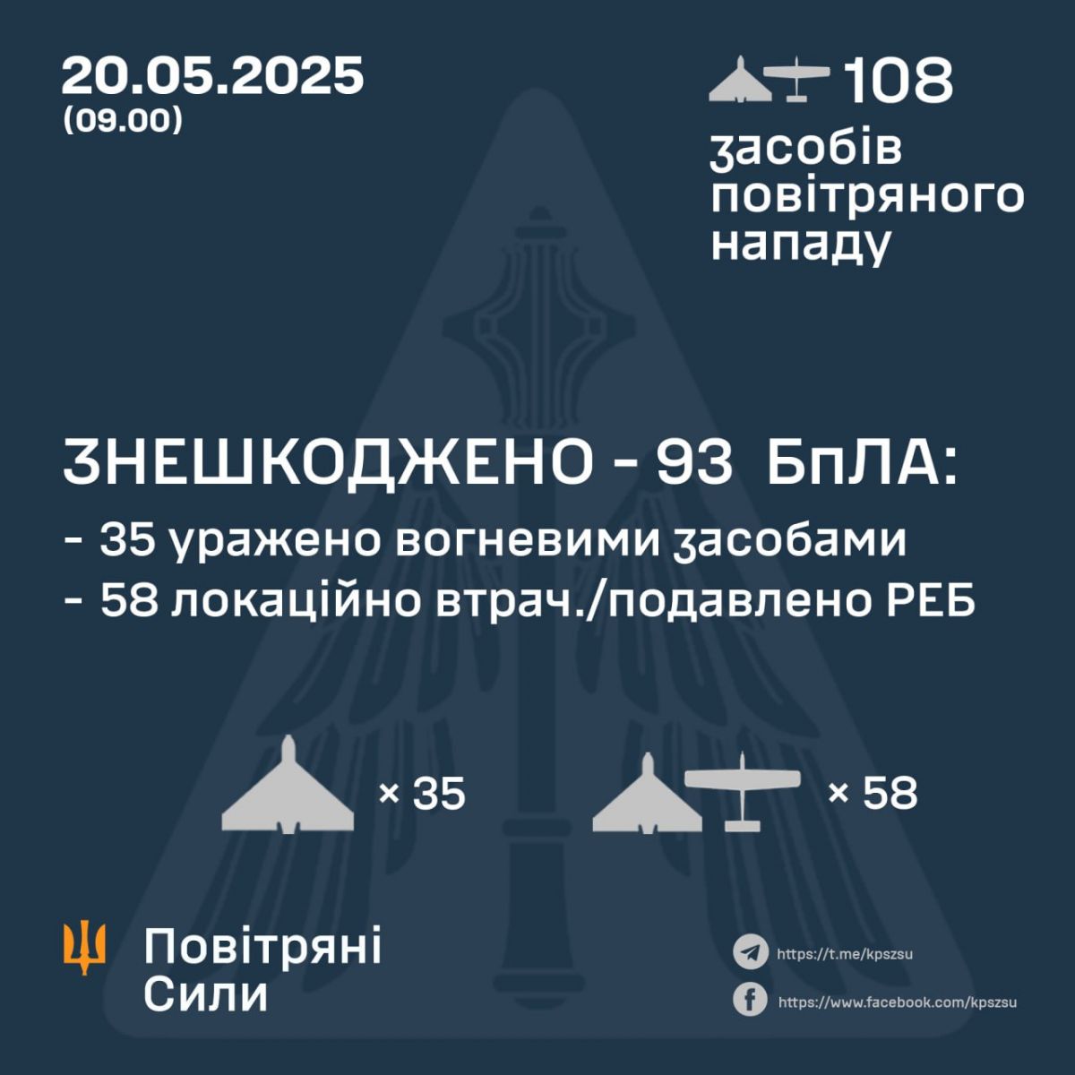 https://racurs.ua/n206435-obstrely-ukrainy-rashisty-atakovali-108-dronami.htmlРакурсУ ніч на 20 травня Сили ППО знешкодили 93 російські безпілотники.