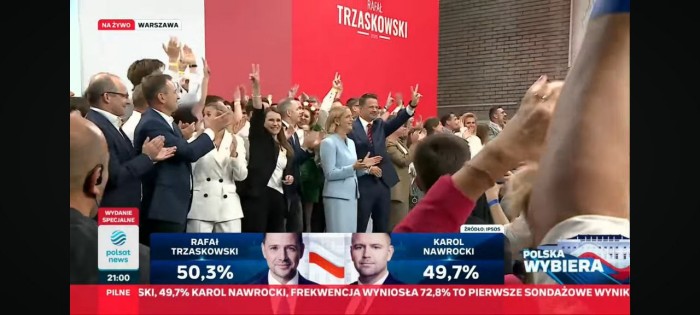 У першому турі різниця між ними склала майже 2% на користь Тшасковського. Проте результати екзит-полу другого туру центру Ipsos, проведеного для телеканалів Polsat, TVN і TVP, який польські ЗМІ оприлюднили після закриття дільниць для голосування о 21.00 за місцевим часом (о 22.00 за Києвом), показує мінімальний відрив Тшасковського від його конкурента.