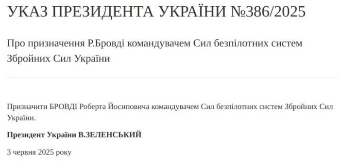 Крім того, указом № 386/2025 командувачем Сил безпілотних систем замість Вадима Сухаревського призначено Роберта «Мадяра» Бровді.