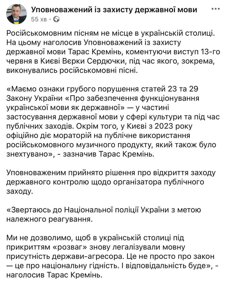 Маємо ознаки грубого порушення статей 23 та 29 Закону України «Про забезпечення функціонування української мови як державної» — у частині застосування державної мови у сфері культури та під час публічних заходів. Окрім того, у Києві з 2023 року офіційно діє мораторій на публічне використання російськомовного музичного продукту, який також було знехтувано, — зазначив Тарас Кремінь.