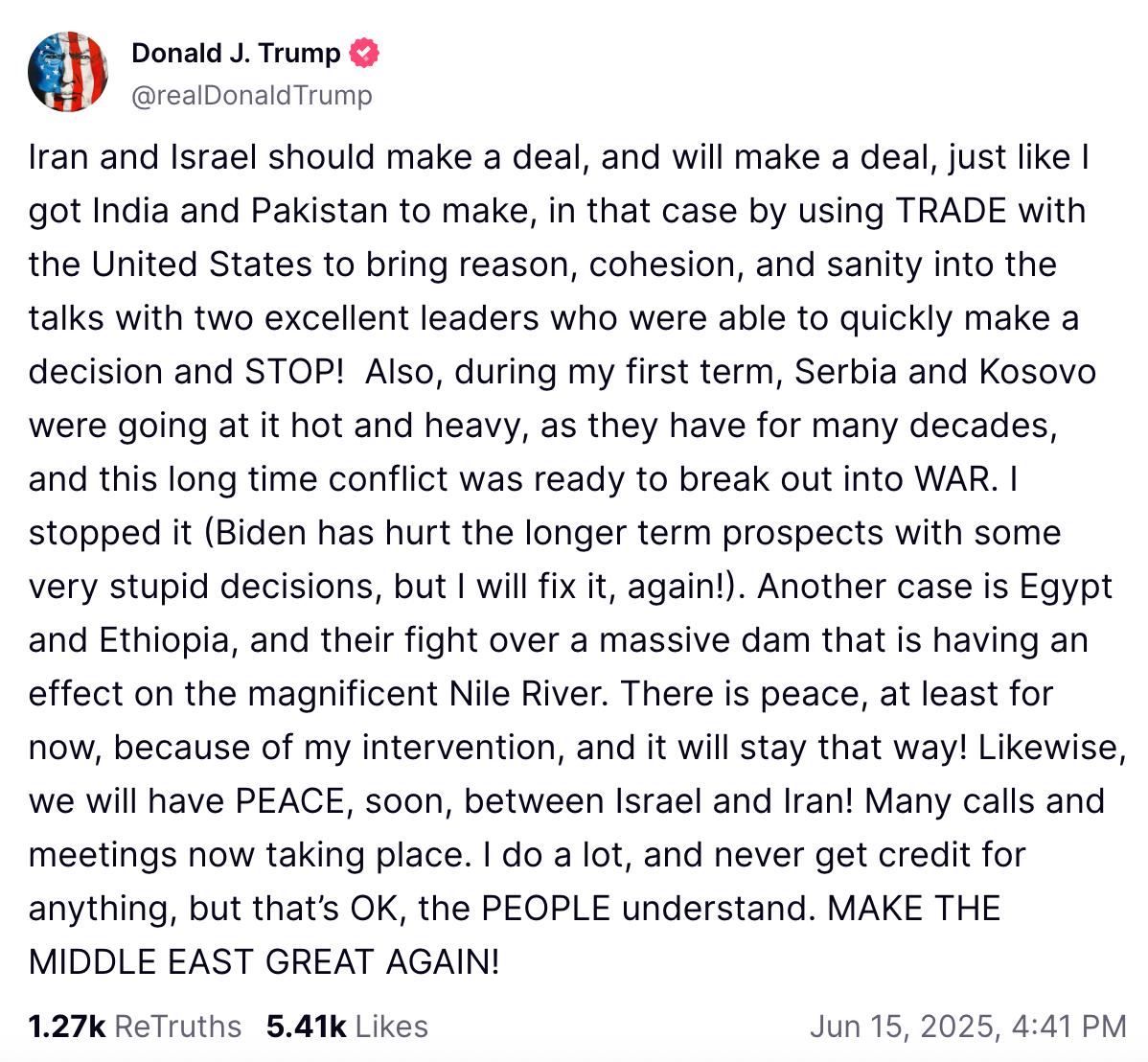 Американський лідер заявив, що Іран та Ізраїль «повинні укласти угоду». Трамп упевнений, що може досягти цього так само, як у випадку Індії та Пакистану — за допомогою торгівлі. Відповідний допис він зробив у своїй соцмережі Truth Social.