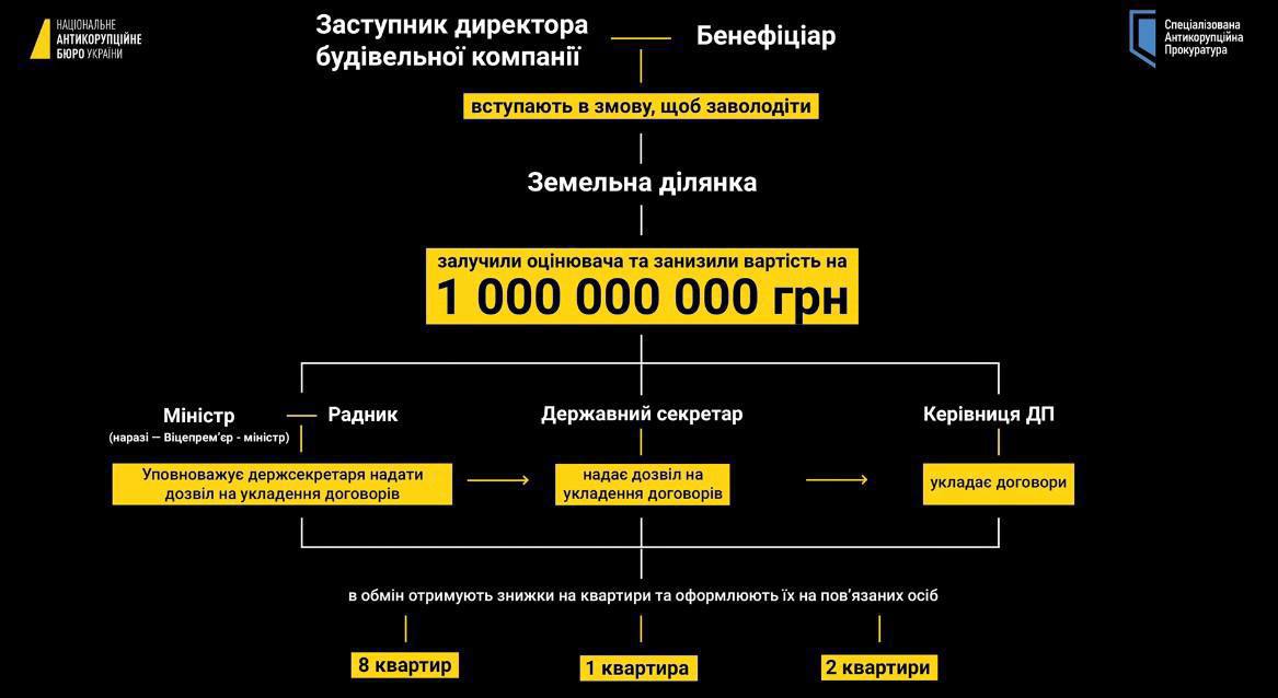 У схемі, ймовірно, брали участь тодішній міністр розвитку громад Олексій Чернишов, його радник Максим Горбатюк, держсекретар Василь Володін та директорка держпідприємства Алла Сушон, пише ЦПК.