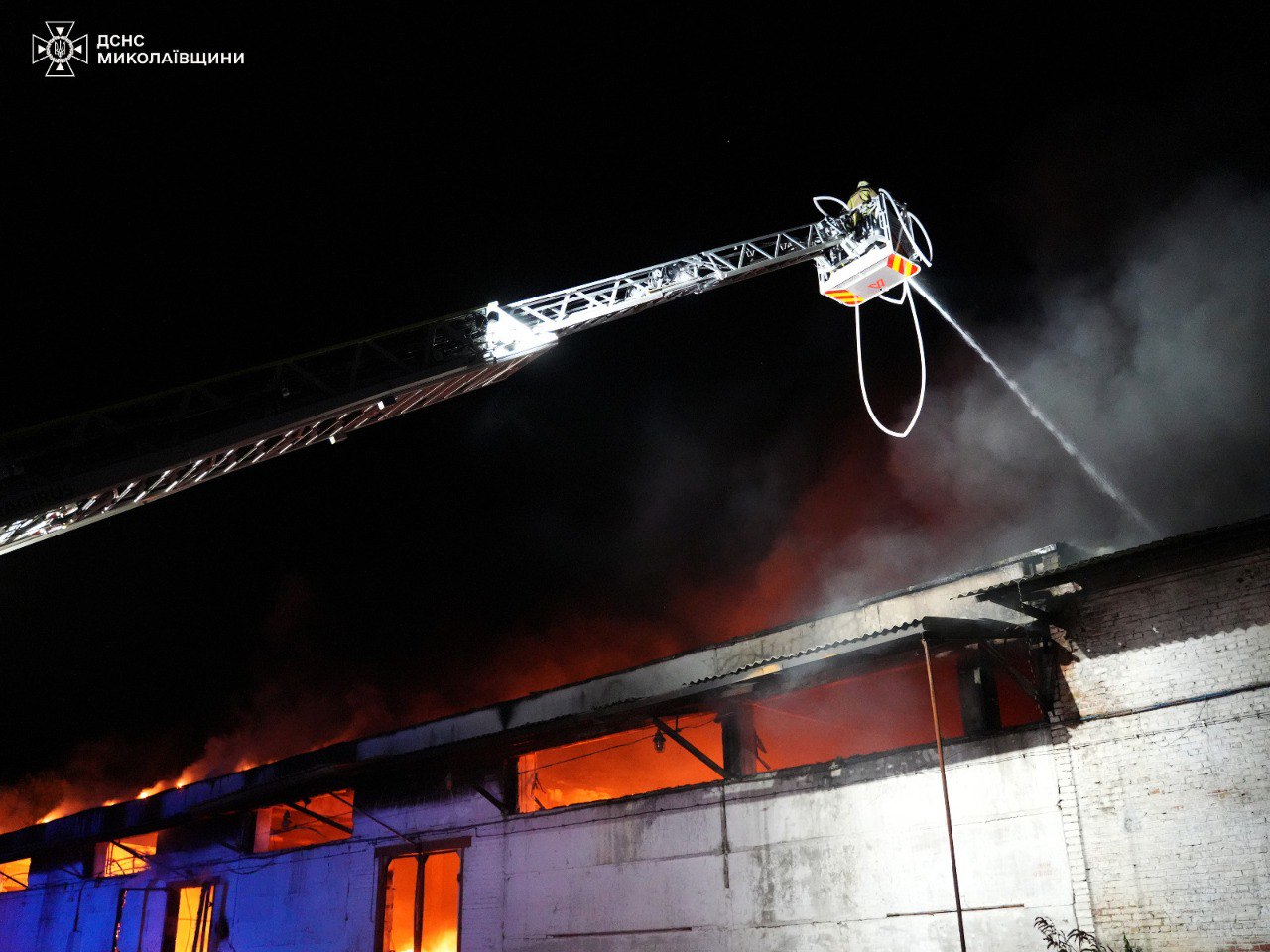 У Миколаєві внаслідок влучання безпілотниками загорілося складське приміщення харчової промисловості й пожежа охопила площу в 3 тис. 500 кв. м. Гасили вогонь 25 вогнеборців та сім одиниць техніки. Інформація про постраждалих не надходила.