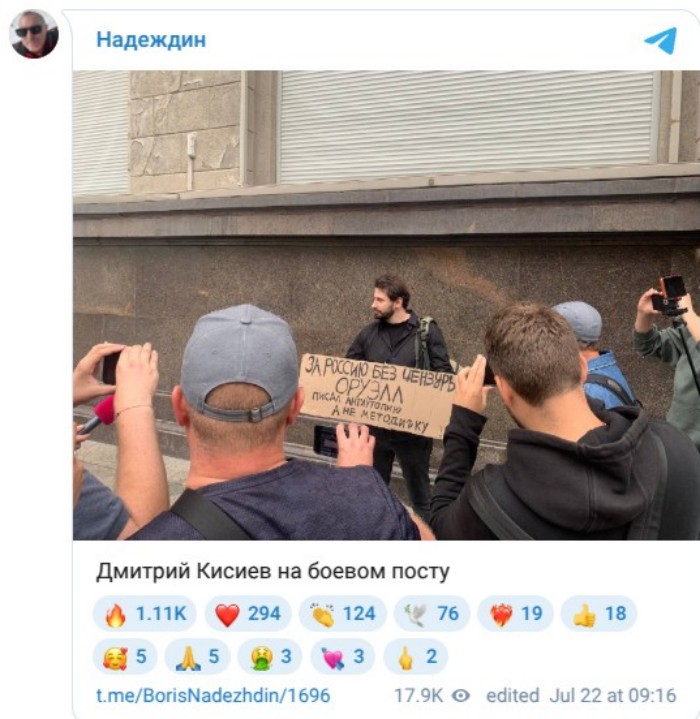 Зазначається, що під час третього читання у держдумі виступив глава мінцифри пф Максут Шадаєв, який заявив, що цей закон «дозволяє балансувати: з одного боку — не допустити подальшого поширення екстремістських матеріалів, з іншого боку — не ухвалювати рішення про блокування великих західних платформ поки що».