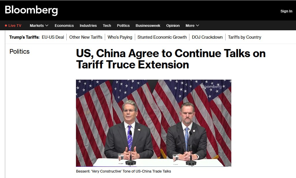 США і Китай домовилися продовжити переговори щодо збереження митного перемир’я, яке завершується 12 серпня 2025 року. Міністр фінансів Бессент заявив, що остаточне рішення про продовження ухвалить президент Трамп після брифінгу в середу, пише Bloomberg.