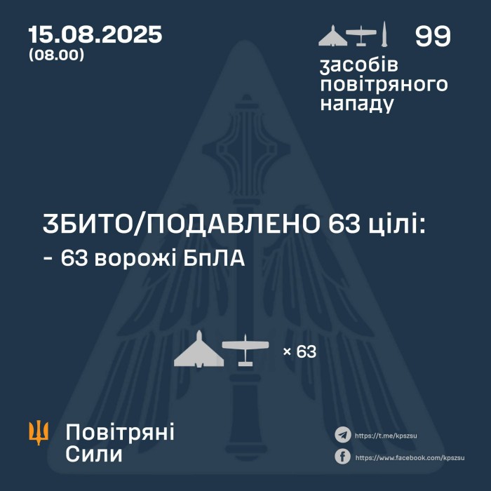 - протиповітряною обороною збито/подавлено 63 ворожі БпЛА типу Shahed і дрони-імітатори різних типів на півночі та сході країни;