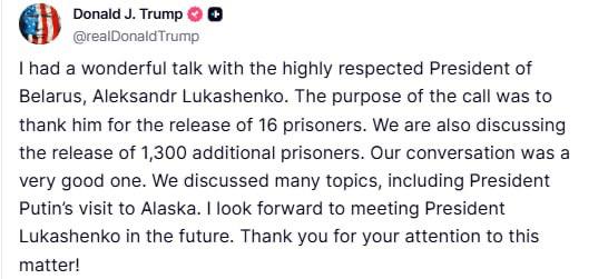 Я мав чудову розмову з високоповажним президентом білорусі олександром лукашенком. Мета дзвінка полягала в тому, щоб подякувати йому за звільнення 16 ув’язнених. Ми також обговорюємо звільнення ще 1 тис. 300 ув’язнених, — йдеться в повідомленні.