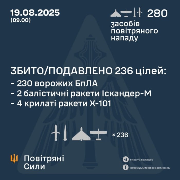За попередніми даними, станом на 09.00, протиповітряною обороною збито/подавлено 236 повітряних цілей: