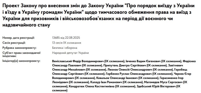 Законопроект № 13685 пропонує внести зміни до низки чинних законів, зокрема до того, що стосується порядку в’їзду/виїзду. У нинішньому його варіанті — право виїхати з України не зможуть обмежувати тим, хто цього чи наступного року не може бути мобілізований. Тобто їм не виповниться 25 років. Додаткових умов, наприклад, виїзд тільки на навчання, там немає.