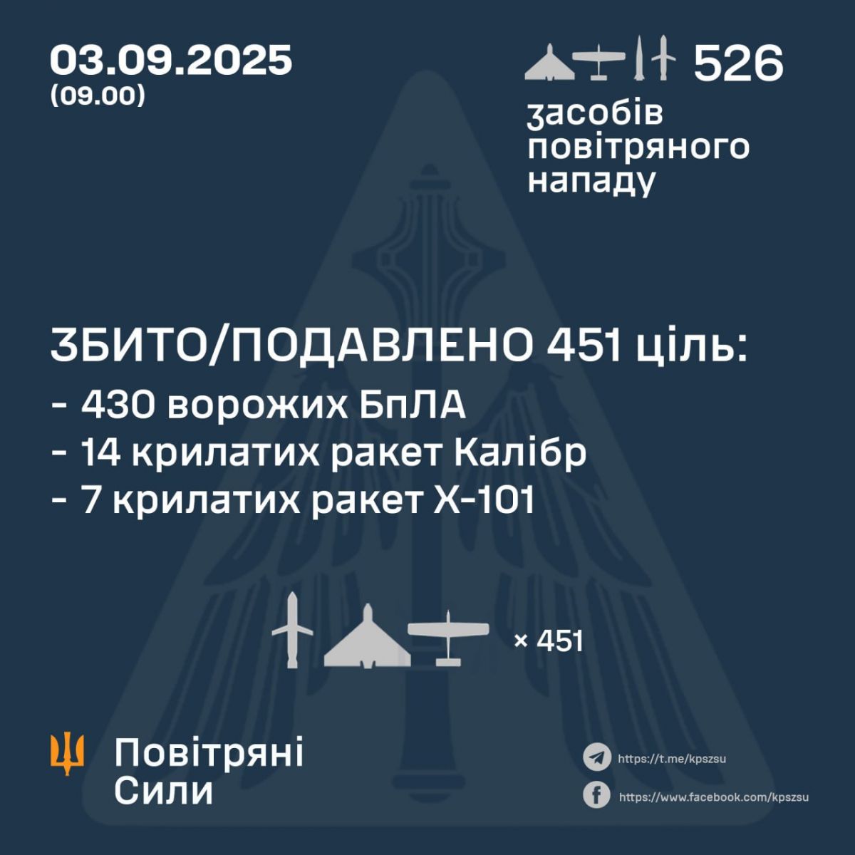У ніч на 3 вересня ворог завдав комбінованого удару по території України із застосуванням ударних БпЛА, ракет повітряного та морського базування. Загалом в українському небі спостерігалося 526 засобів повітряного нападу: 502 ударних БпЛА типу Shahed і безпілотників-імітаторів різних типів, 16 крилатих ракет «Калібр» та вісім крилатих ракет Х-101. Про це Повітряні сили ЗСУ повідомили у Telegram.
