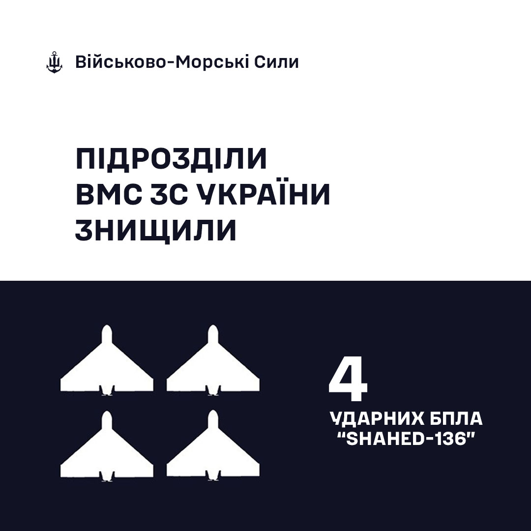 Також у ВМС поінформували, що сьогодні вночі їхні підрозділи змогли збити чотири ворожих дрони-камікадзе Shahed-136.
