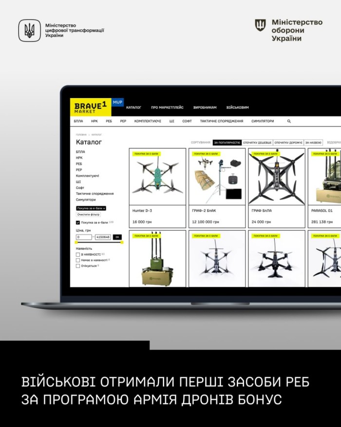 Військові підрозділи вже активно використовують бали за знищення ворога та обмінюють їх на потрібну техніку в Brave1 Market, — зазначив він. — Перші засоби РЕБ, замовлені в межах оновленої програми Армія дронів. Бонус, уже поставлені на фронт.