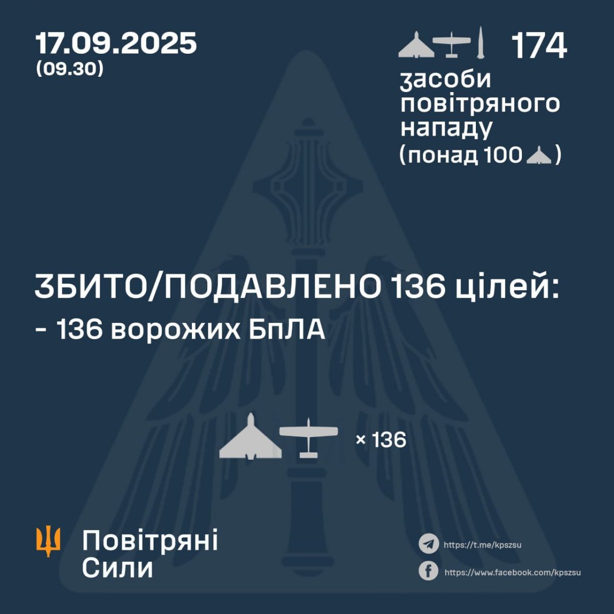 У ніч на 17 вересня противник атакував балістичною ракетою Іскандер-М/KN-23 та зенітною керованою ракетою С-300 із Ростовської та Курської областей. Також з шести напрямків були запущені 172 ударних БпЛА типу Shahed, «Гербера» і безпілотники інших типів. Про це Повітряні сили ЗСУ повідомили у Telegram.