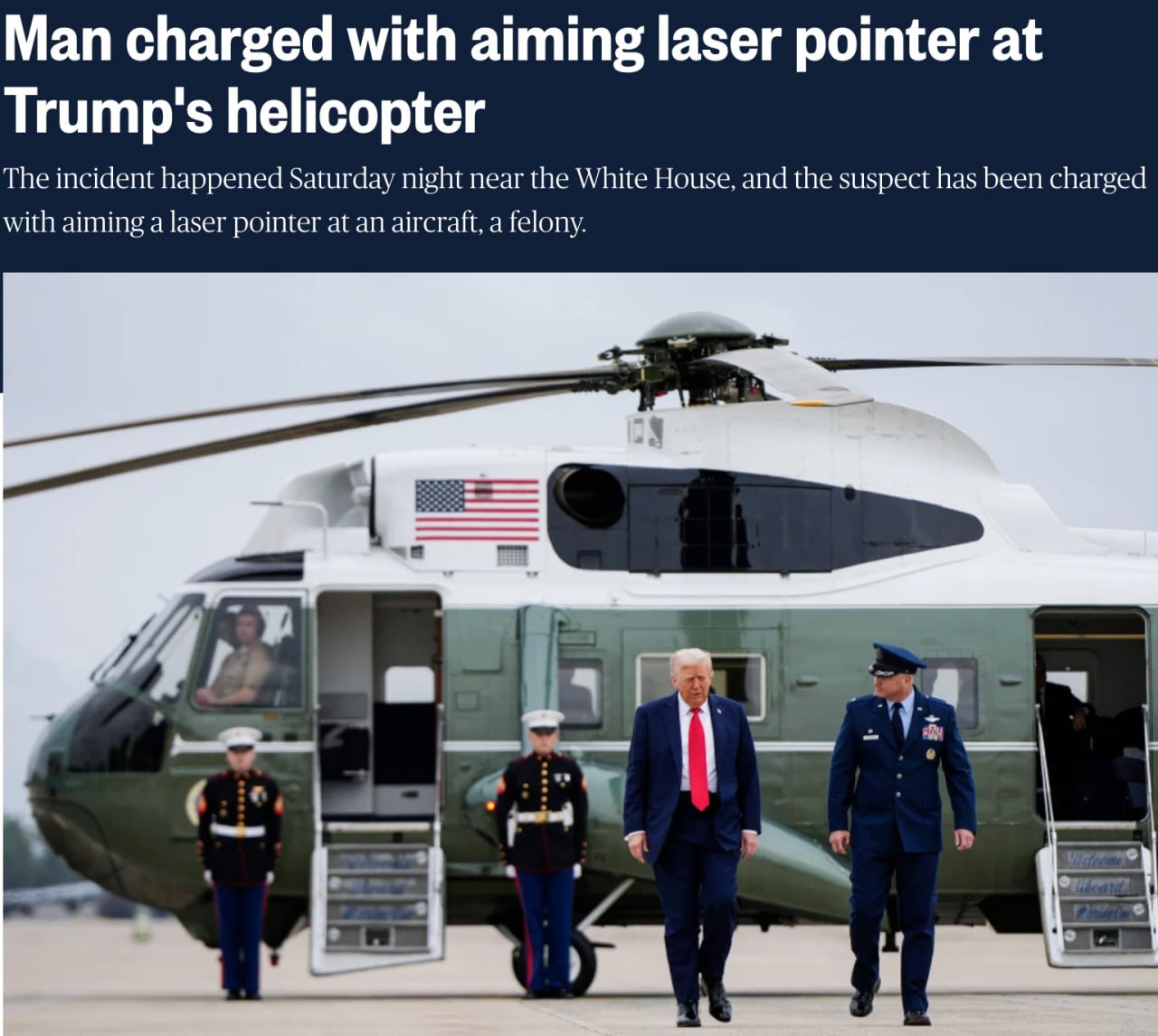 https://racurs.ua/n209253-v-vashingtone-mujchina-celilsya-v-vertolet-trampa-lazerom-nbc-news.htmlРакурсУ Вашингтоні чоловік світив лазерною указкою на вертоліт із американським президентом Дональдом Трампом на борту.