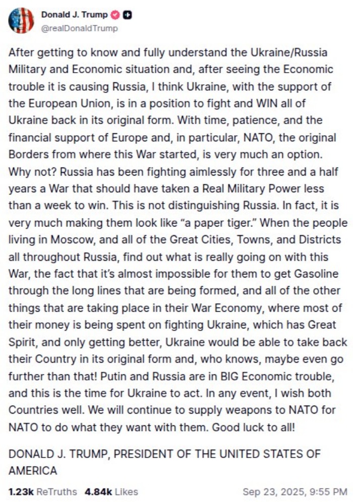 Президент США Дональд Трамп заявив про це у новому повідомленні, опублікованому сьогодні, 23 вересня, на його сторінці у соцмережі Truth Social.