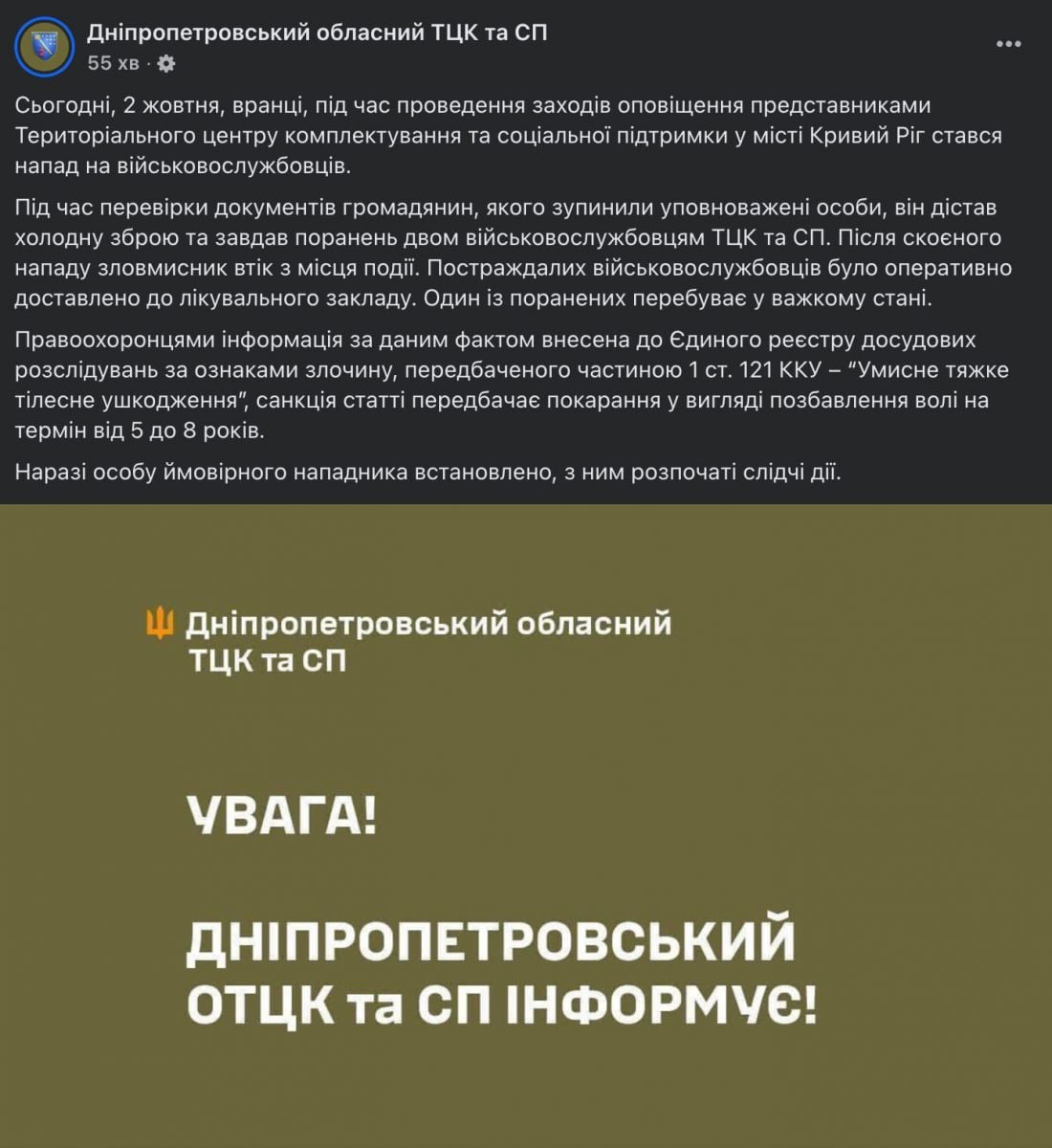 У Кривому Розі чоловік з ножем напав на двох військовослужбовців Територіального центру комплектування та соціальної підтримки. Інцидент стався у четвер, 2 жовтня, під час перевірки документів. Про це обласний ТЦК та СП повідомив у Facebook.