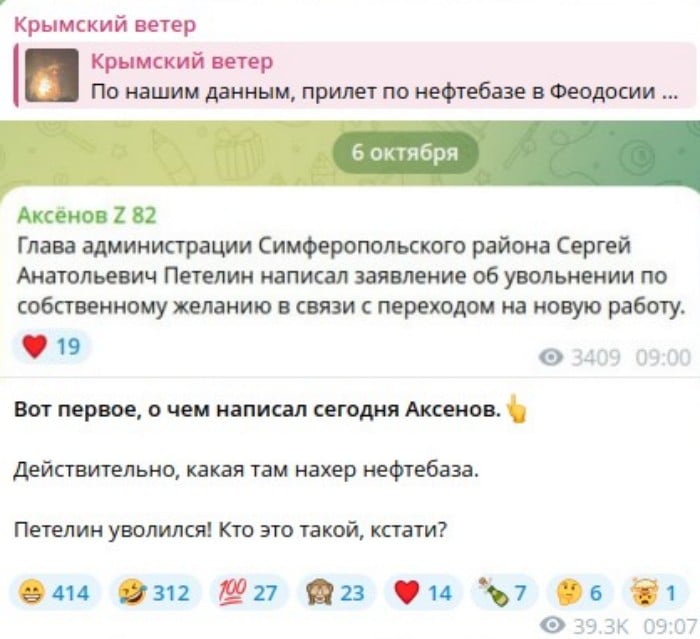 Зазначається, що за понад 10 годин після удару по нафтобазі ні очільник окупаційної адміністрації Криму колабораціоніст Сергій Аксьонов, ні голова так званого парламенту Криму колабораціоніст Володимир Костантинов ніяк цю подію не прокоментували.