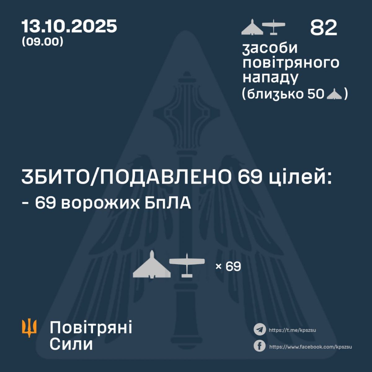 З 20.00 12 жовтня ворог запустив ударні БпЛА типу Shahed, «Гербера» і безпілотників інших типів з російських Орла, Курська, Приморсько-Ахтарська. Близько 50 з них були дронами-камікадзе. До відбиття атаки залучалися авіація, зенітні ракетні війська, підрозділи РЕБ та безпілотних систем й мобільні вогневі групи. Про це Повітряні сили ЗСУ повідомили у Telegram.
