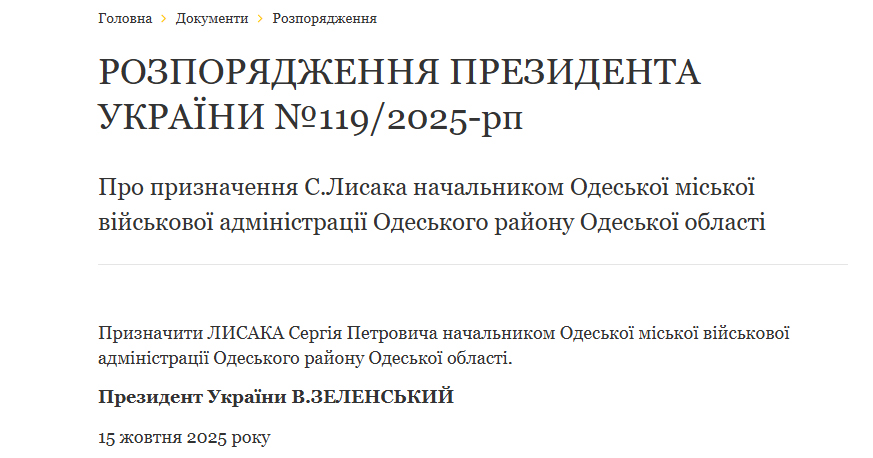 https://racurs.ua/n209695-zelenskiy-naznachil-glavu-dnepropetrovskoy-ova-lysaka-glavoy-odesskoy-mva.htmlРакурсСергій Лисак призначений головою Одеської міської військової адміністрації.