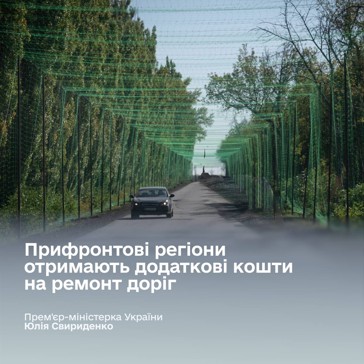 Свириденко також поінформувала, що уряд виділяє додаткові кошти на ремонт доріг. На ремонт автомобільних доріг у прифронтових Сумській і Харківській областях, а також для Полтавської області, спрямують понад 700 млн грн. Премєр наголосила, що це важливі логістичні дороги, якими рухається військова техніка, гуманітарні вантажі та якими евакуюють людей.