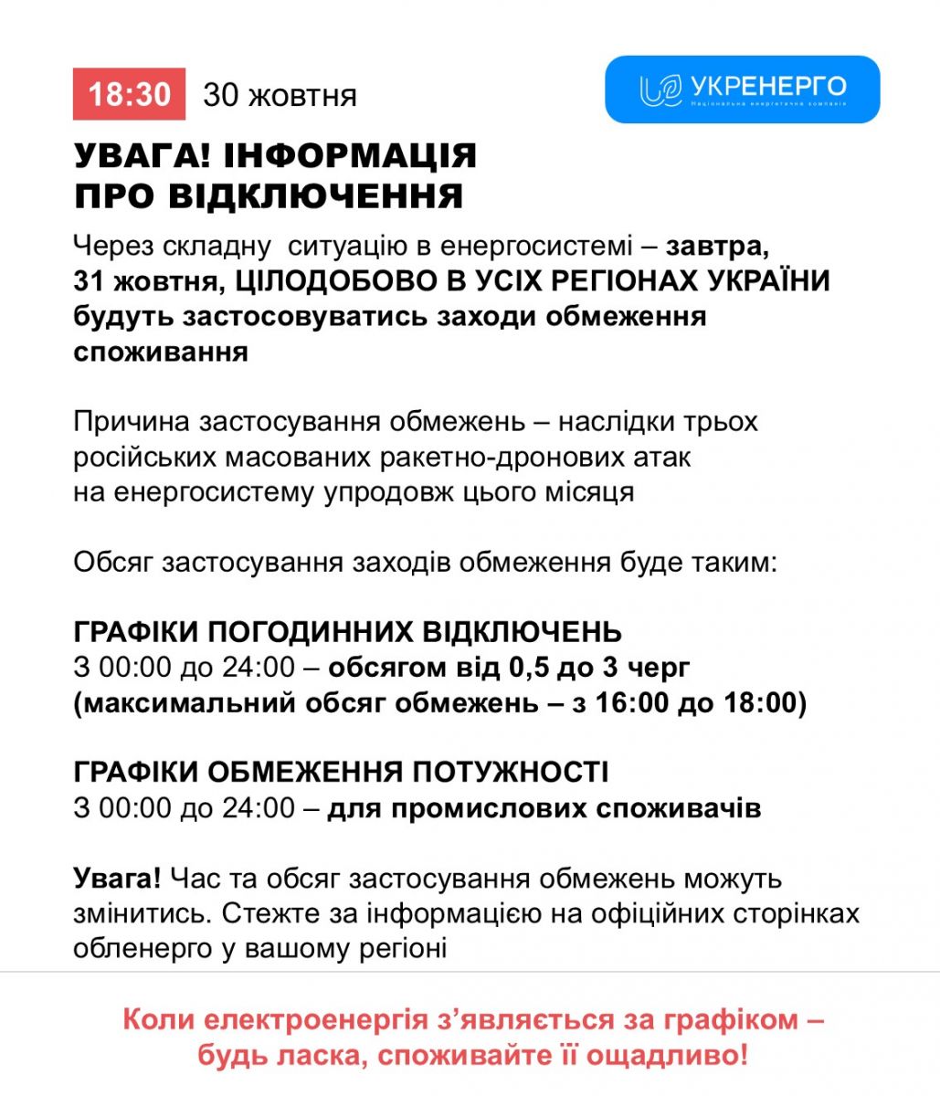 Енергетики зазначили, що причиною застосування графіків стали сьогоднішня російська атака на енергетичну інфраструктуру України.