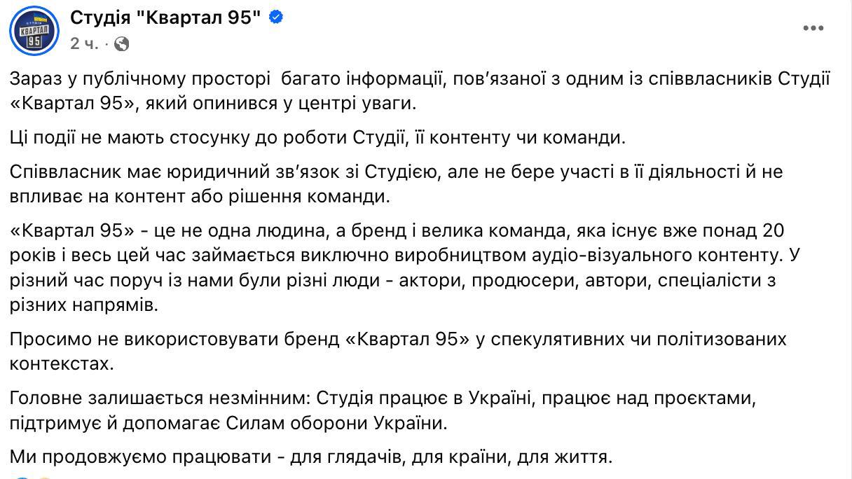 Співвласник має юридичний зв’язок зі Студією, але не бере участі в її діяльності й не впливає на контент або рішення команди. «Квартал 95» — це не одна людина, а бренд і велика команда, яка існує вже понад 20 років […] Просимо не використовувати бренд «Квартал 95» у спекулятивних чи політизованих контекстах, — йдеться у заяві.