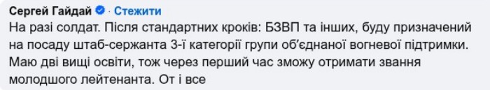 У коментарях до відповідного повідомлення на своїй Фейсбук-сторінці Гайдай зазначив, що наразі має військове звання «солдат».