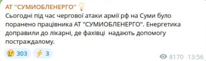 Згодом в ОВА повідомили, що сьогодні Росія двічі поцілила в об'єкт критичної інфраструктури у Сумській громаді.