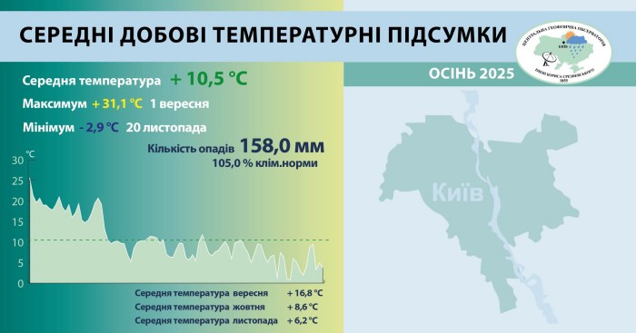 10,5 °С, що вище кліматичної норми на 1,8 °С. Це робить осінь 2025 року шостою у рейтингу найтепліших у Києві з 1881 року.
