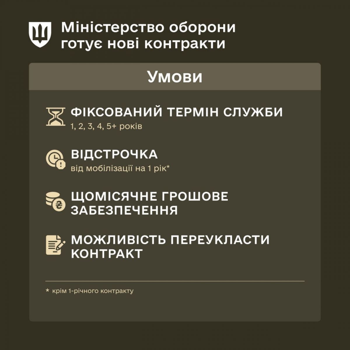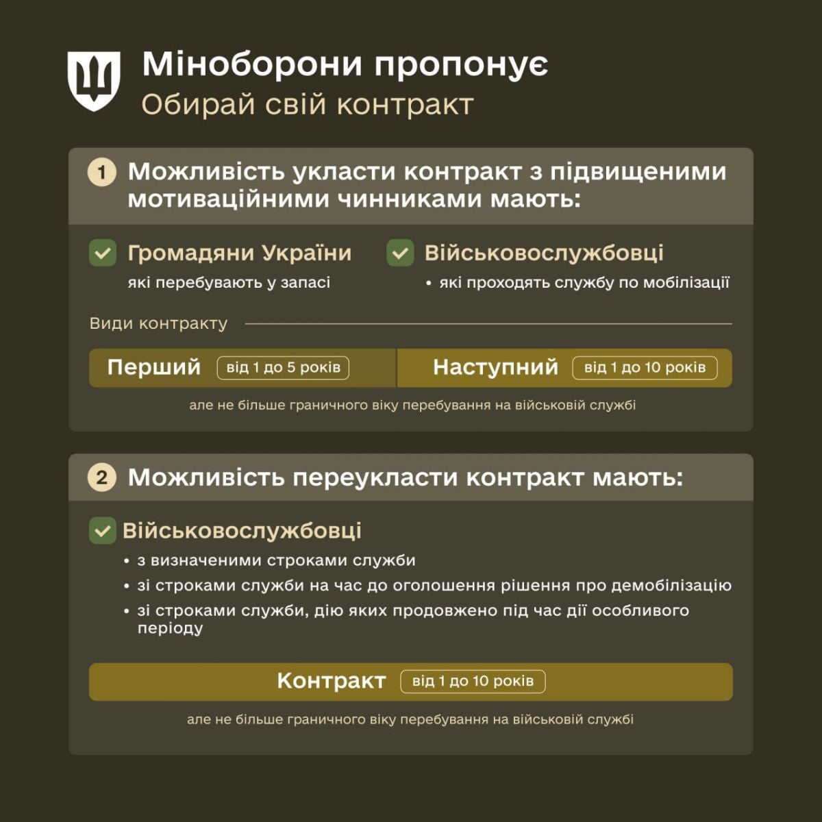 В Міноборони поінформували, що нові контракти зможуть укласти громадяни, які перебувають в запасі та резервісти, мобілізовані військовослужбовці. Чинні бійці, які вже служать за контрактом, матимуть змогу переукласт контракт на нових умовах.