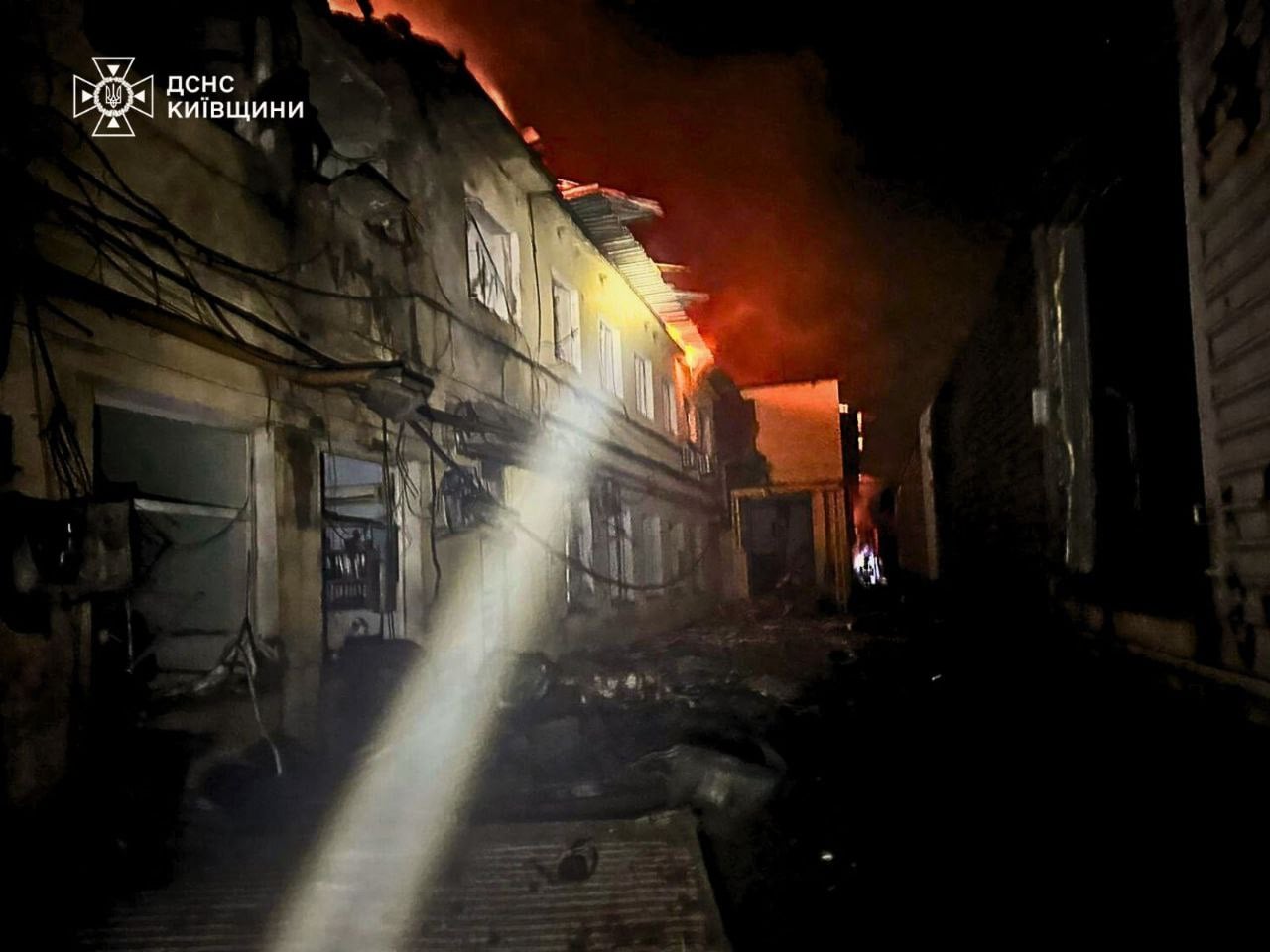 Також, як поінформували у Державній службі з надзвичайних ситуацій, в Київській області російські війська знову завдали ударів дронами по Фастову. Загорілися покрівлі триповерхової та одноповерхової будівель на площі 1 тис. 500 кв. м. Вибухова хвиля пошкодила приватний житловий будинок та адмінбудівлі. Всі пожежі вже ліквідовано.