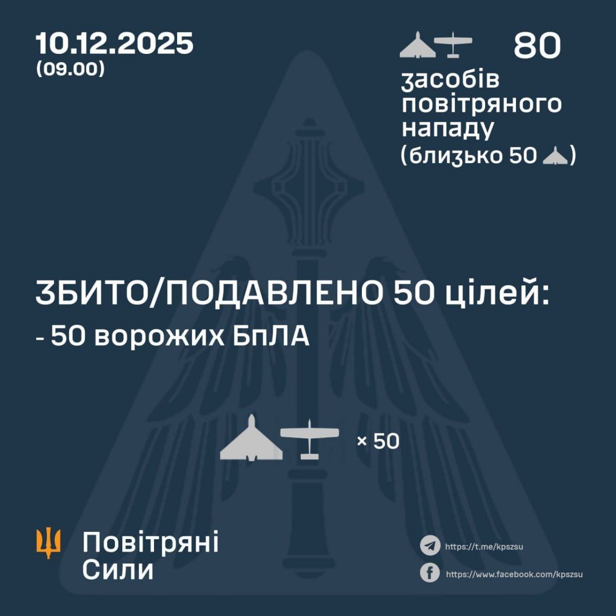 У ніч на 10 грудня ворог атакував 80-ма ударними БпЛА типу Shahed, «Гербера» і безпілотниками інших типів із напрямків. Дрони злітали з російських Курська, Приморсько-Ахтарська, Міллєрово й Чауди в окупованому Криму. Близько півсотні були «шахедами». Про це Повітряні сили ЗСУ 10 грудня повідомили у Telegram.