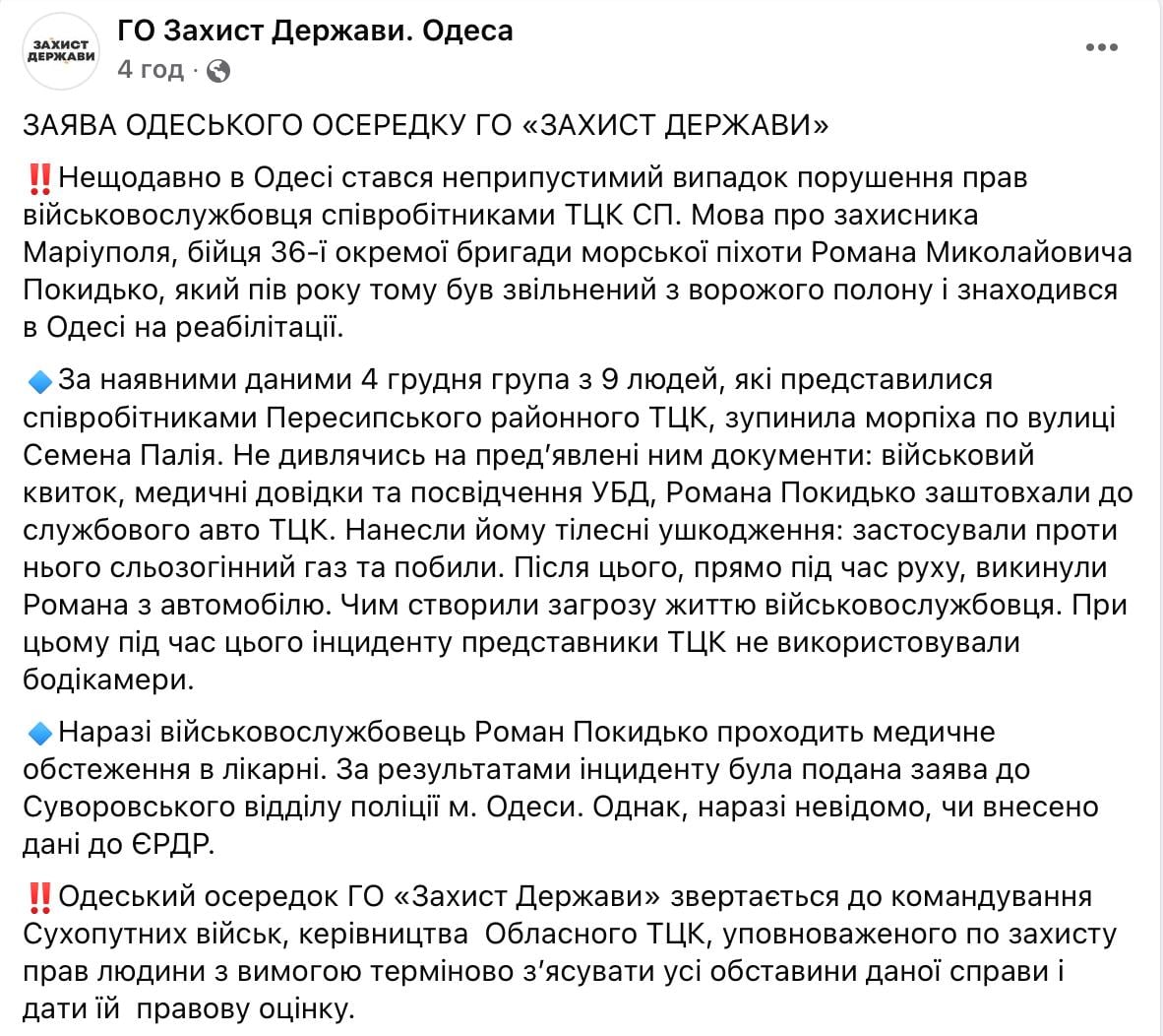 https://racurs.ua/n210838-tckshniki-v-odesse-izbili-osvobojdennogo-iz-plena-morpeha.htmlРакурсВ Одесі співробітники ТЦК побили звільненого з російського полону морпіха.