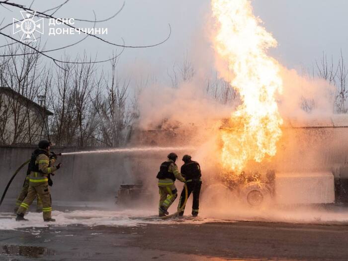 Також виникли пожежі складської будівлі, ємності автоцистерни та сміття. Надзвичайники ліквідували загоряння на площі 520 кв. м. Про це повідомила прес-служба ДСНС Донеччини.