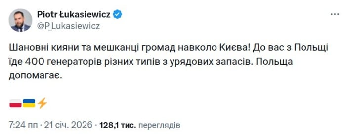 Шановні кияни та мешканці громад навколо Києва! До вас із Польщі їде 400 генераторів різних типів з урядових запасів. Польща допомагає, — зазначив він.