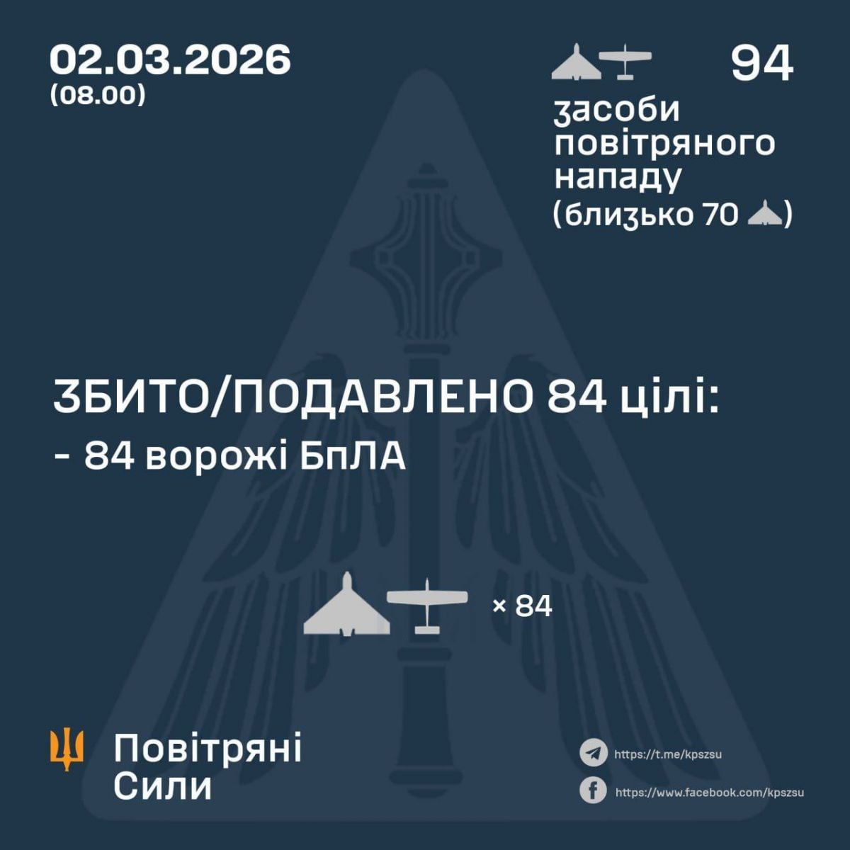 https://racurs.ua/n212350-ukrainskaya-pvo-nochu-obezvredila-84-rossiyskih-bpla-no-byli-i-popadaniya.htmlРакурсСили ППО України вночі 2 березня ліквідували 84 з 94 російських дронів.