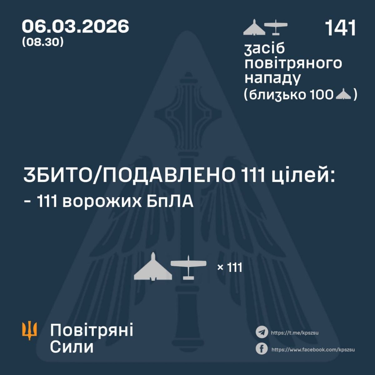 У ніч на 6 березня ворог запустив з Гвардійського та Чауди в окупованому Криму, а також із Орла, Брянська, Курська, Міллерово, Шаталово й Приморсько-Ахтарська в Росії 141 ударний БпЛА типу Shahed, «Гербера», «Італмас» та безпілотники інших типів. Близько 100 із них були «шахедами». Про це Повітряні сили ЗСУ повідомили у Telegram.