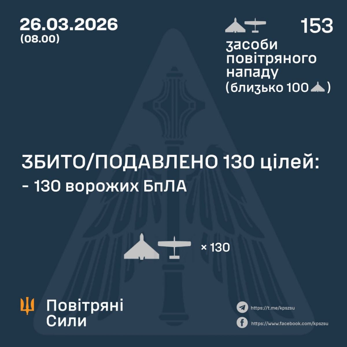 У ніч на 26 березня ворог запустив ударні БпЛА типу Shahed, «Гербера», «Італмас» та безпілотники інших типів із чотирьох напрямків у Росії та одного — в окупованому Криму. Близько сотні дронів були «шахедами». Відбивали атаку авіація, зенітні ракетні війська, підрозділи РЕБ та безпілотних систем й мобільні вогневі групи. Про це Повітряні сили ЗСУ 26 березня повідомили у Telegram.