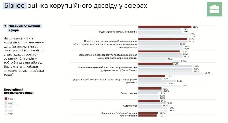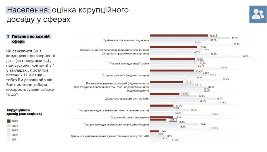 Так, у 2021 році рівень корупційного досвіду в більшості сфер перевищував 30%, а в правоохоронних органах із корупцією стикався кожен другий громадянин.