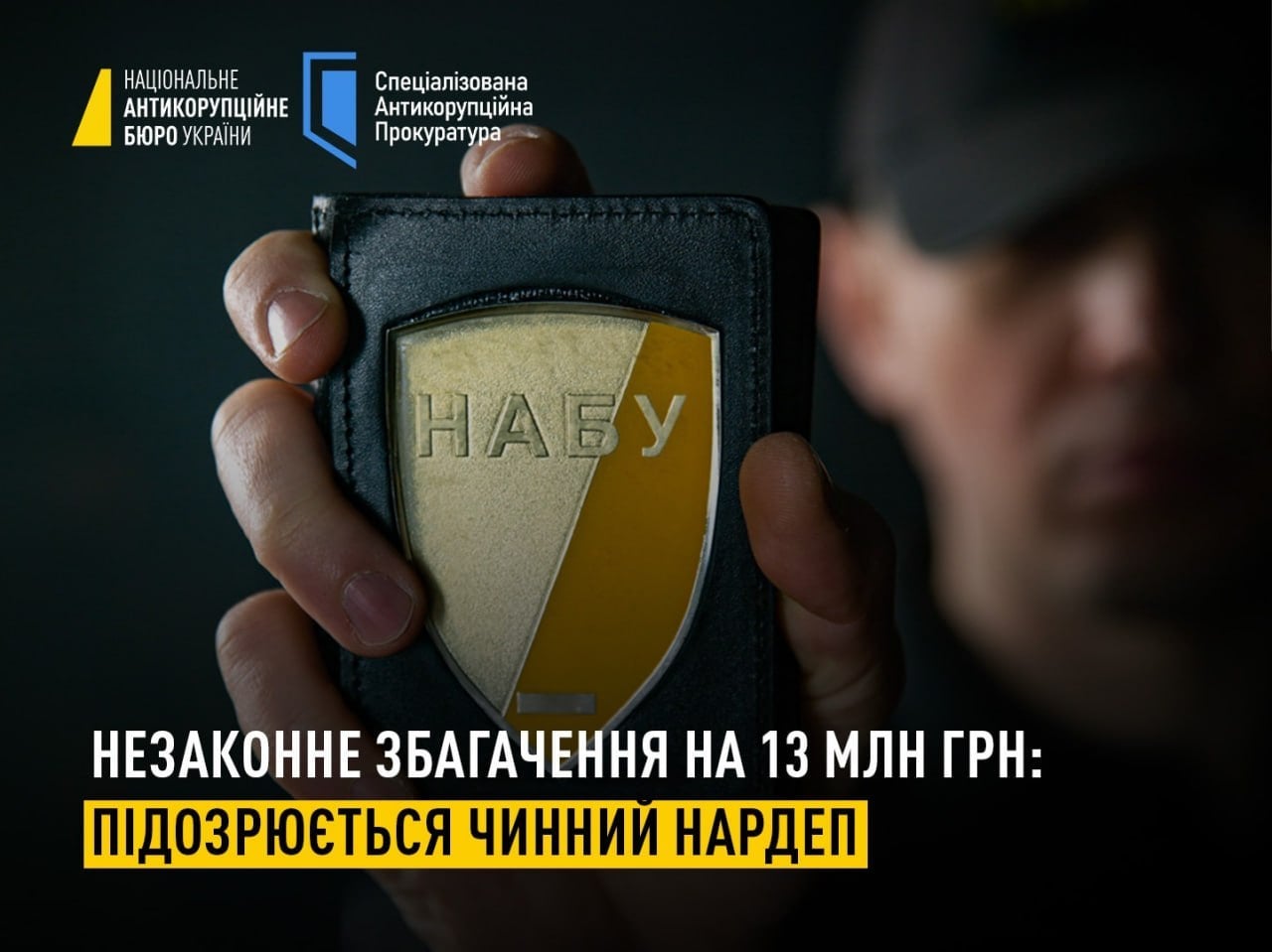 Антикорупційне бюро і Спеціалізована антикорупційна прокуратура викрили на незаконному збагаченні чинного парламентаря, який упродовж 2020−2021 років став власником активів на загальну суму майже 13 млн грн. Ця сума значно перевищувала рівень його офіційно задекларованих доходів. Про це НАБУ 6 квітня повідомило у Telegram.
