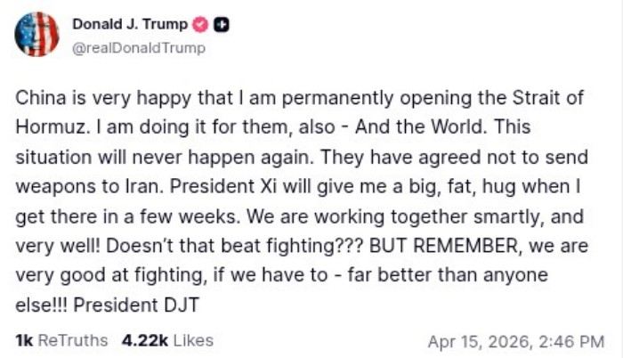 Китай дуже радий, що я назавжди відкриваю Ормузьку протоку. Я роблю це також заради них — і заради всього світу, — заявив він.