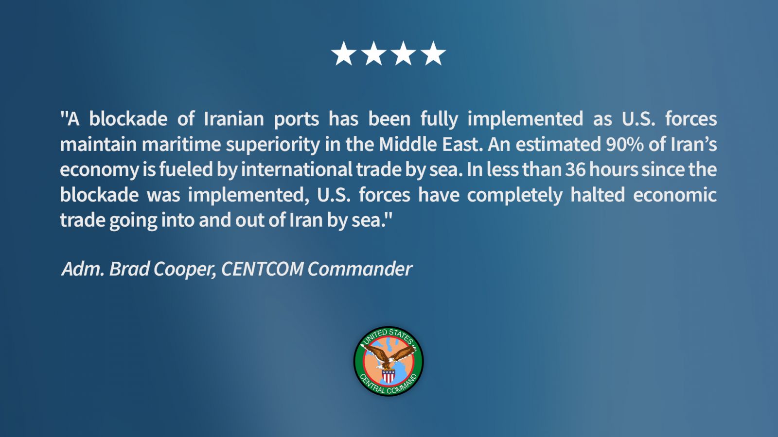 Приблизно 90% економіки Ірану підживлюється міжнародною торгівлею морем. Менш ніж за 36 годин з моменту запровадження блокади американські війська повністю зупинили всю економічну торгівлю, що надходить до Ірану та вивозиться з нього морем, — вказано в заяві.