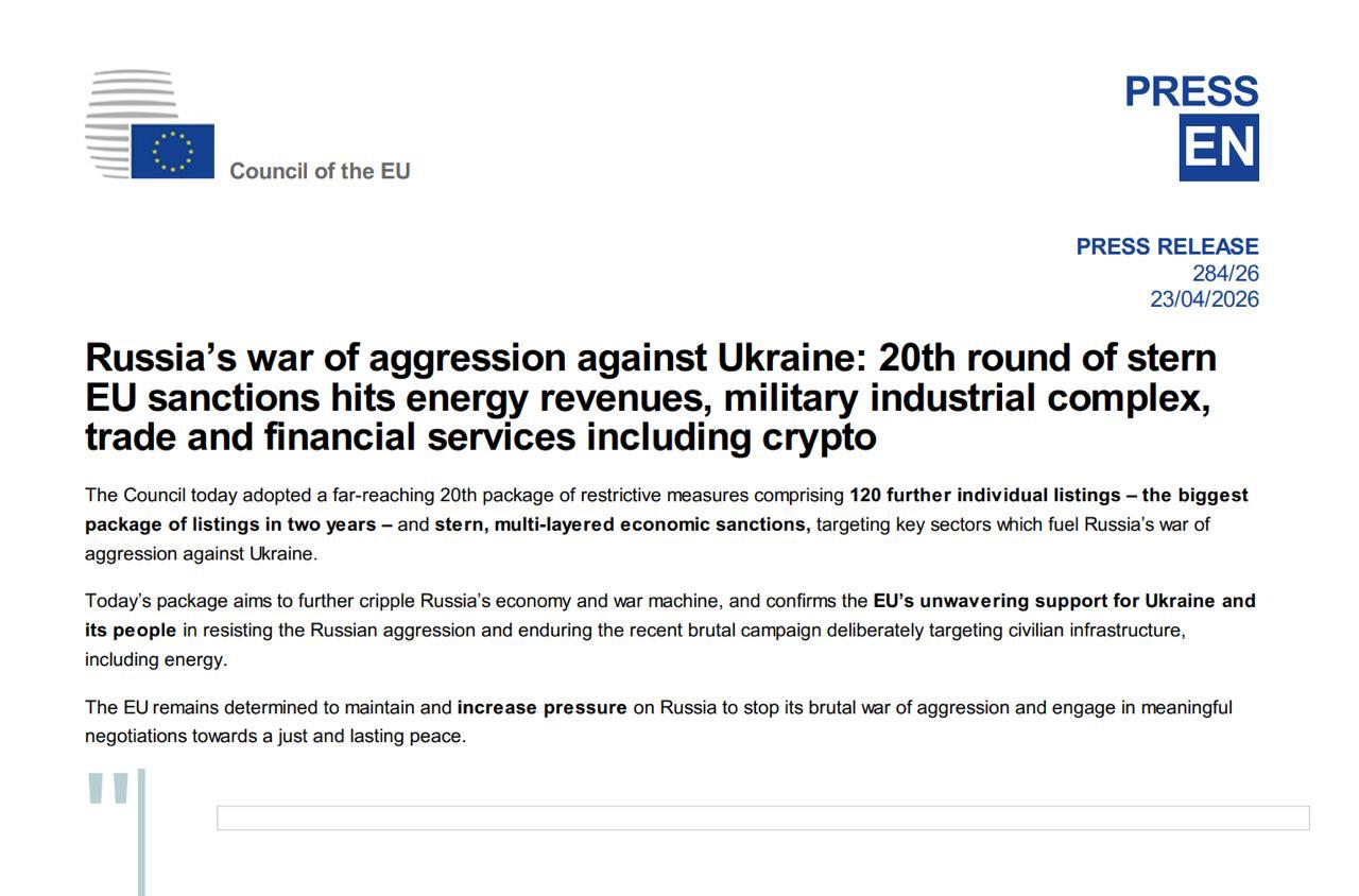 Нагадаємо, 23 квітня Європейський Союз офіційно затвердив 20-й пакет санкцій проти РФ. Цього ж дня європейці також узгодили надання Україні кредиту у розмірі 90 млрд євро на 2026−2027 роки.
