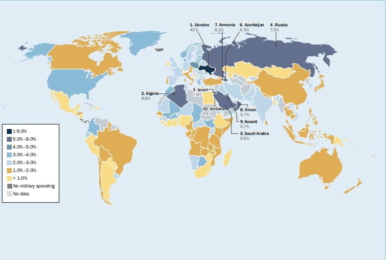 Витрати України на оборону в 2025 році зросли приблизно на 20% (в порівннянні з 2016 роком — на 1 тис. 501%) — до 84,1 млрд дол. або 40% ВВП. Це найбільші військові витрати в історії незалежної України і найбільші витрати в світі стосовно внутрішнього валового продукту. Другу сходинку з витрат ВВП на оборону посідає Алжир з 8,8%. Бюлетень про тренди у світових військових витратах за минулий рік опублікував Стокгольмський інститут дослідження проблем миру (SIPRI).