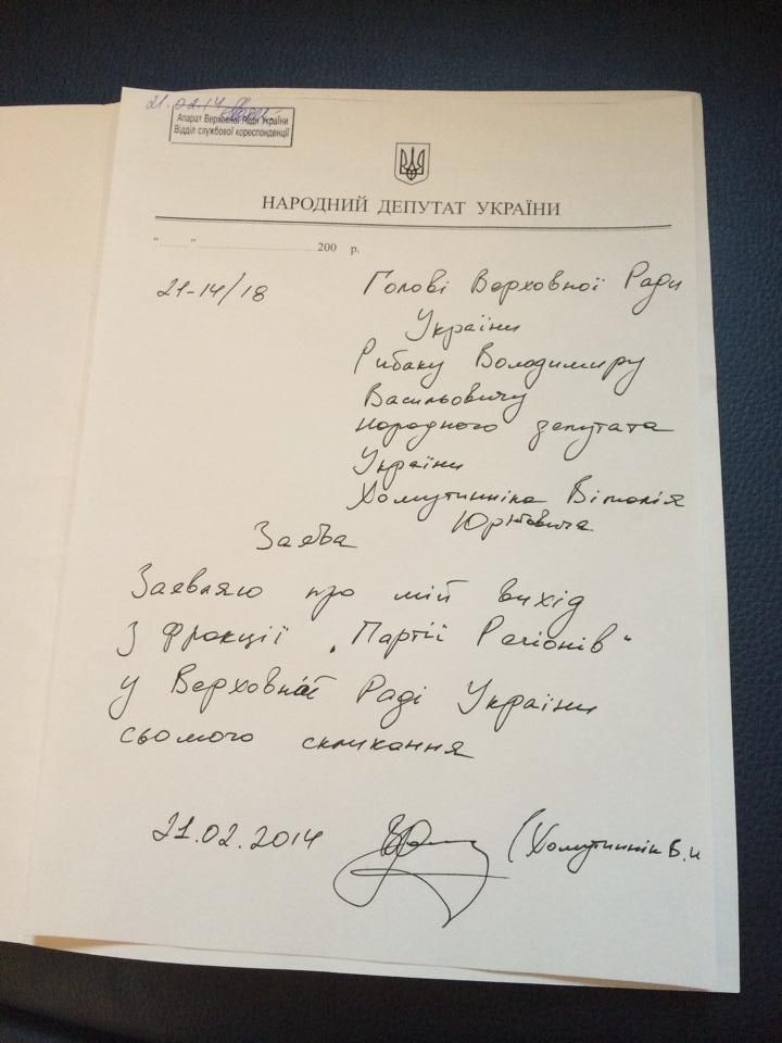 https://racurs.ua/n22986-homutynnik-zayavil-o-vyhode-iz-partii-regionov-dokument.htmlРакурс«Сегодня мы находимся в шаге от гражданской войны. Ситуация вышла из-под контроля: в центре столицы расстреливают людей, мирное население в панике прячется по домам, пытаясь защитить себя и своих детей от мародеров на улицах. У парламента был шанс урегулировать ситуацию, но мы не сумели им мудро воспользоваться. И, как видим, не у всех хватает мудрости сделать это даже сейчас. Я принял решение выйти из Партии регионов», — написал Хомутынник на своей странице в Facebook.
