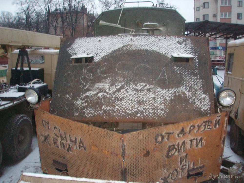 https://racurs.ua/n43129-odessity-izgotovili-dlya-voysk-ato-chudo-bronemashinu-foto.htmlРакурсМастера обшили КамАЗ стальными листами. Их укрепили слоем специальной керамики. По словам активистов, автоматные пули и мелкие осколки броня выдерживает, сообщает «Думская».