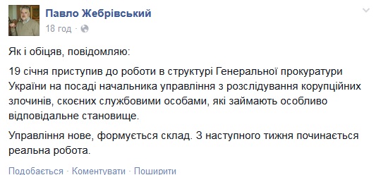 https://racurs.ua/n43169-novoe-antikorrupcionnoe-upravlenie-gpu-vozglavil-glava-ukrainskoy-partii.htmlРакурсОб этом Жебривский сообщил на своей странице в Facebook. На сайте ГПУ пока не сообщается о назначении.